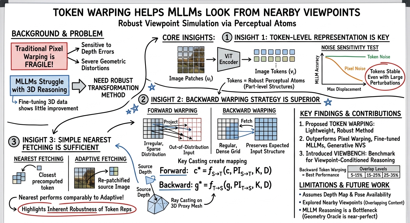 - Core Idea: Introduces token warping as a robust method to enable Multimodal Large Language Models (MLLMs) to reason about scenes from nearby viewpoints, by warping the model's internal image tokens rather than synthesizing new pixels.