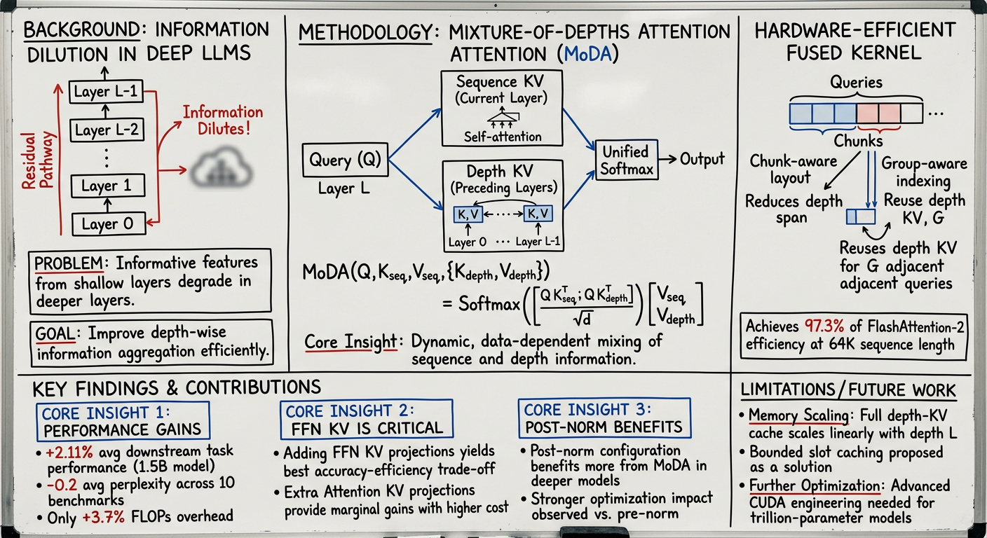 - Core Contribution: Introduces Mixture-of-Depths Attention (MoDA), a novel attention mechanism for Transformers that allows each query to attend to both standard sequence-level Key-Value (KV) pairs and depth KV pairs from preceding layers at the same token position. This addresses the information dilution problem in deep LLMs where informative features from shallow layers get diluted in deeper layers.
