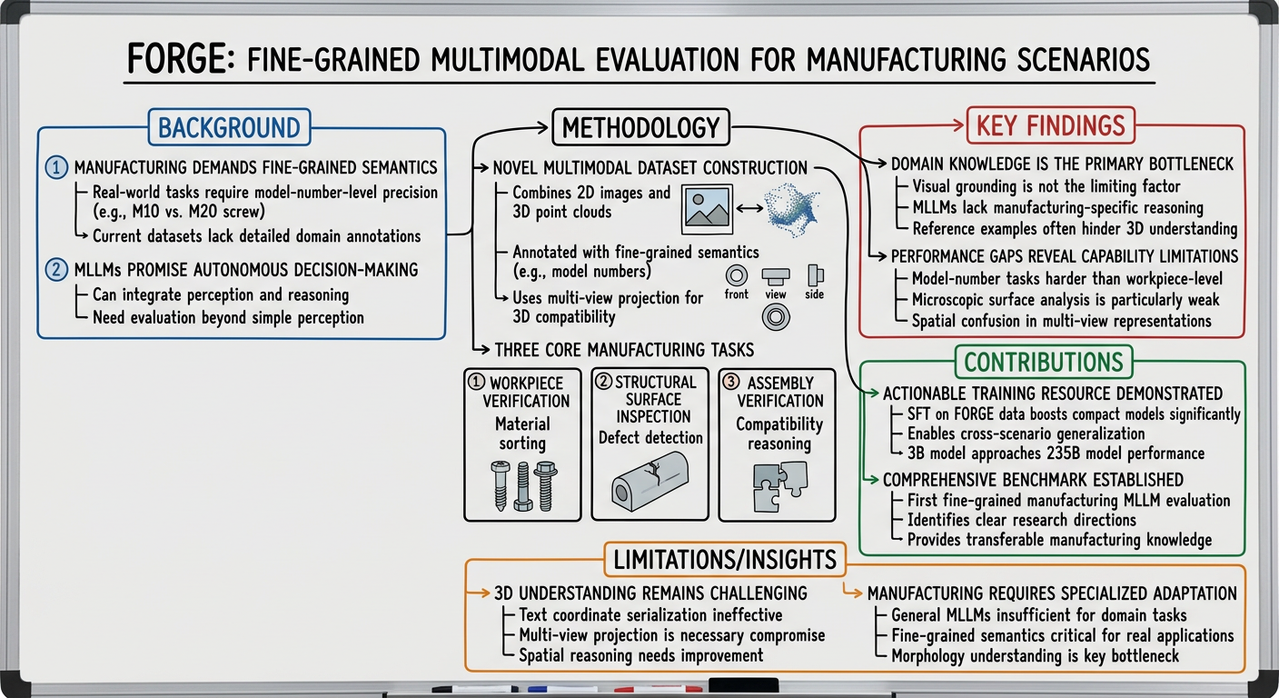 - Introduces FORGE, the first large-scale, fine-grained multimodal benchmark for evaluating Multimodal Large Language Models (MLLMs) in real-world manufacturing scenarios, combining 2D images and 3D point clouds with detailed semantic annotations (e.g., exact model numbers).