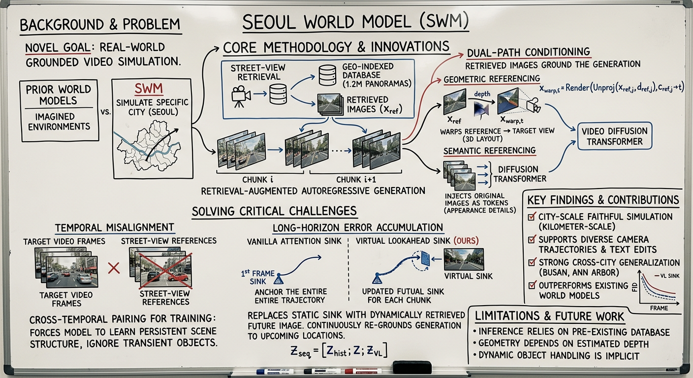 - Core Contribution: Introduces Seoul World Model (SWM), the first city-scale video world model that generates videos grounded in the actual geometry and appearance of a real city (Seoul), moving beyond purely imagined environments.
