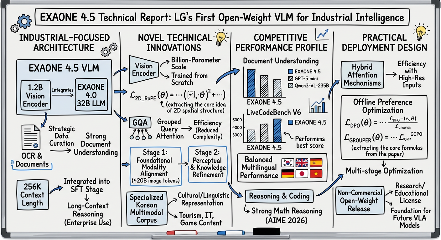 - First Open-Weight VLM from LG AI Research: EXAONE 4.5 is LG's inaugural open-weight Vision-Language Model (VLM), designed for industrial intelligence by integrating a 1.2B-parameter vision encoder into the existing 32B EXAONE 4.0 language model backbone.