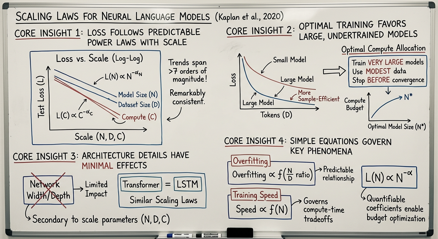 - A core finding is that larger models are dramatically more sample-efficient. Therefore, for a fixed compute budget, the optimal strategy is to train very large models on a modest amount of data and stop training significantly before convergence.