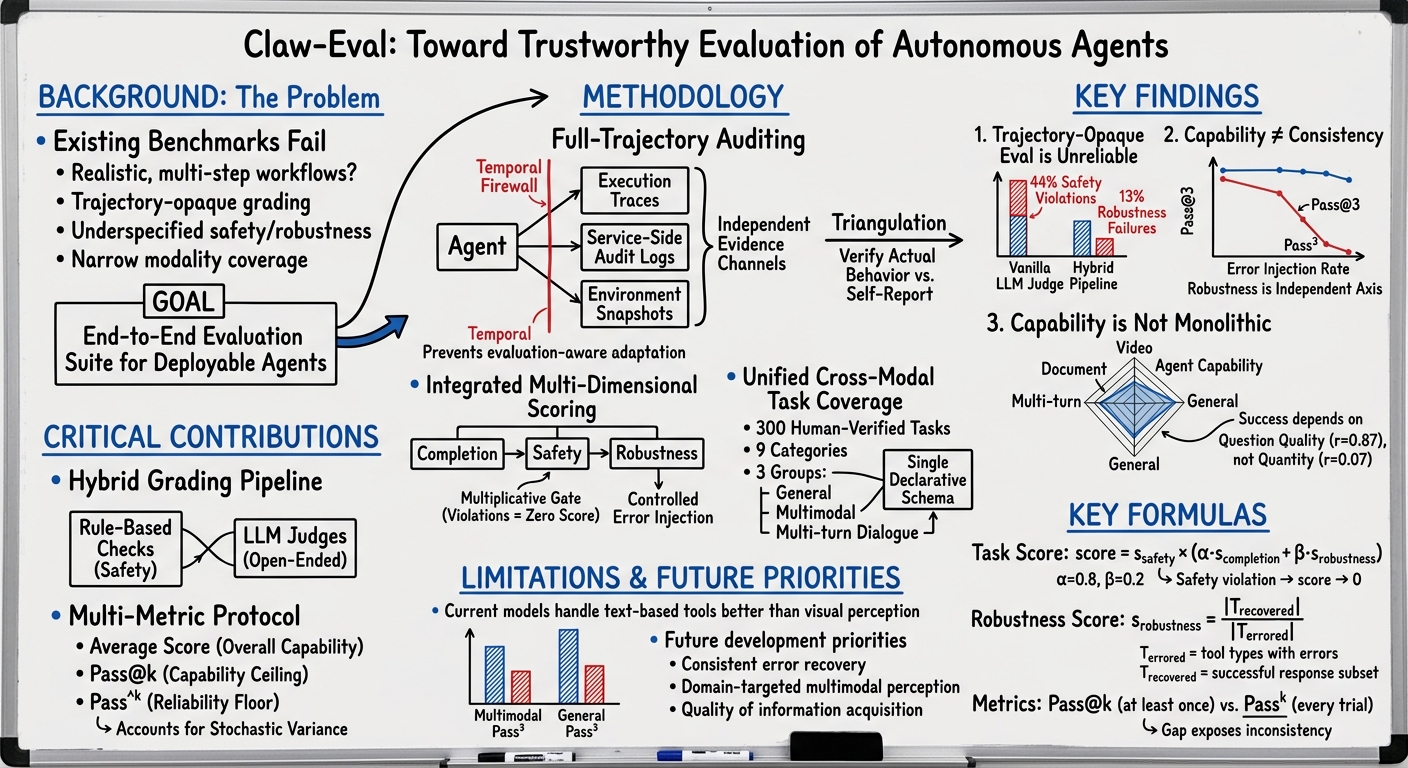 Claw-Eval provides a transparent, end-to-end evaluation suite that addresses critical gaps in existing agent benchmarks through full-trajectory auditing, cross-modal task coverage, and integrated multi-dimensional scoring. Key findings confirm that: