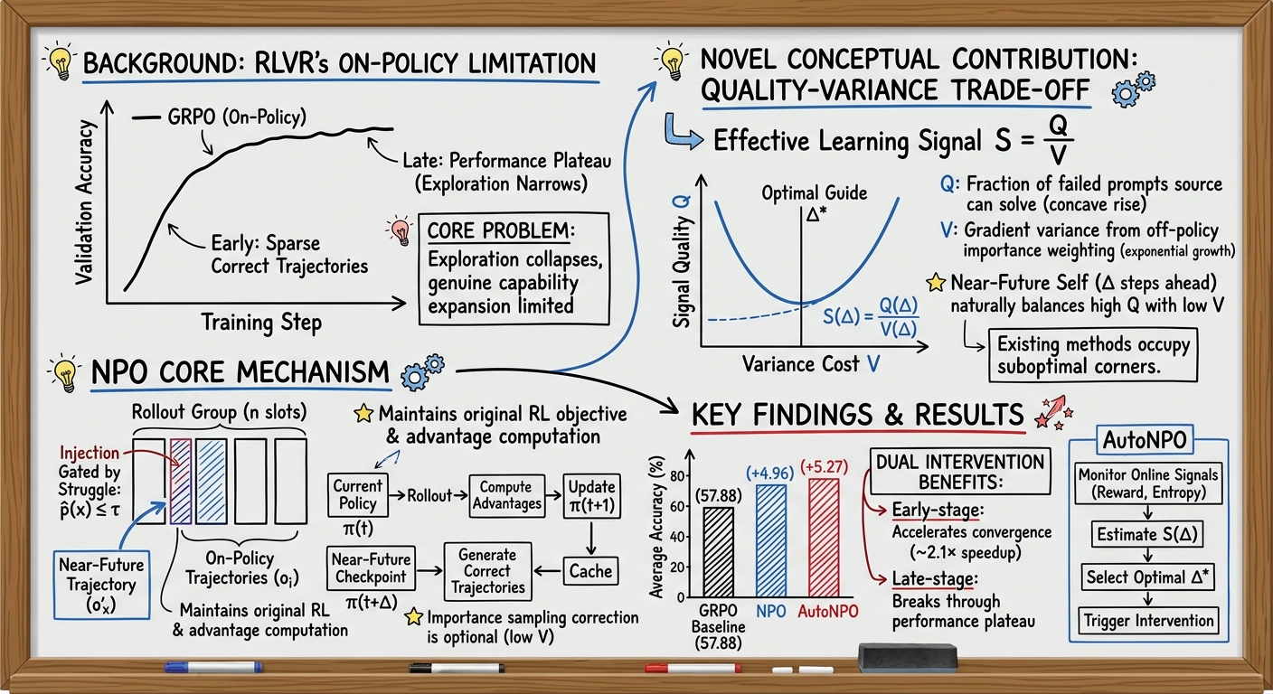 Near-Future Policy Optimization (NPO) introduces a simple yet powerful principle: a model's near-future self is an optimal guide for its current self during RLVR training. By formalizing the trade-off between trajectory quality and variance cost, the paper demonstrates that a checkpoint from the same run, a bounded number of steps ahead, maximizes the effective learning signal.