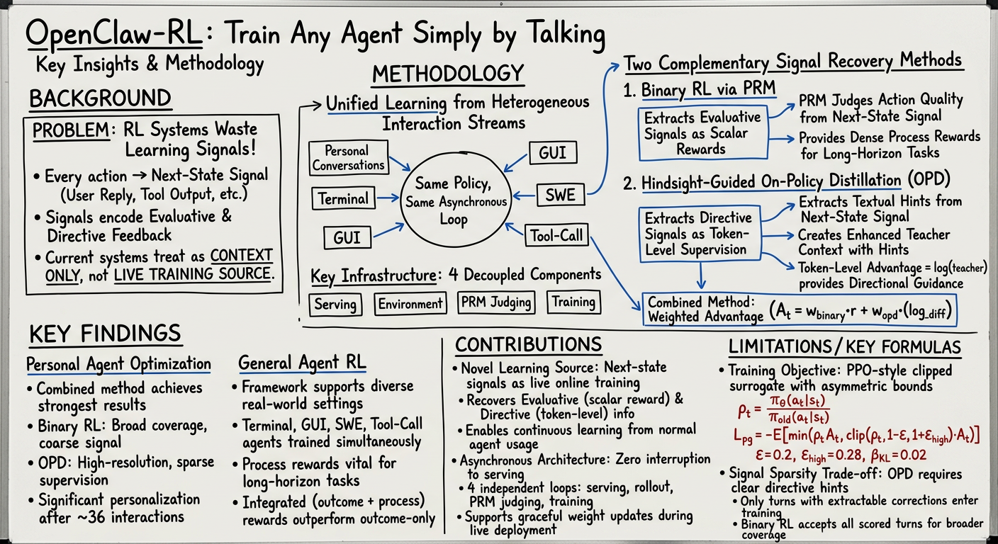 - Unified Online Learning from Next-State Signals: Introduces OpenClaw-RL, a framework that treats diverse agent interactions (conversations, terminal, GUI, SWE, tool-calls) as a single, continuous source of online learning by extracting training signals from the universal "next-state" feedback (e.g., user reply, tool output).
