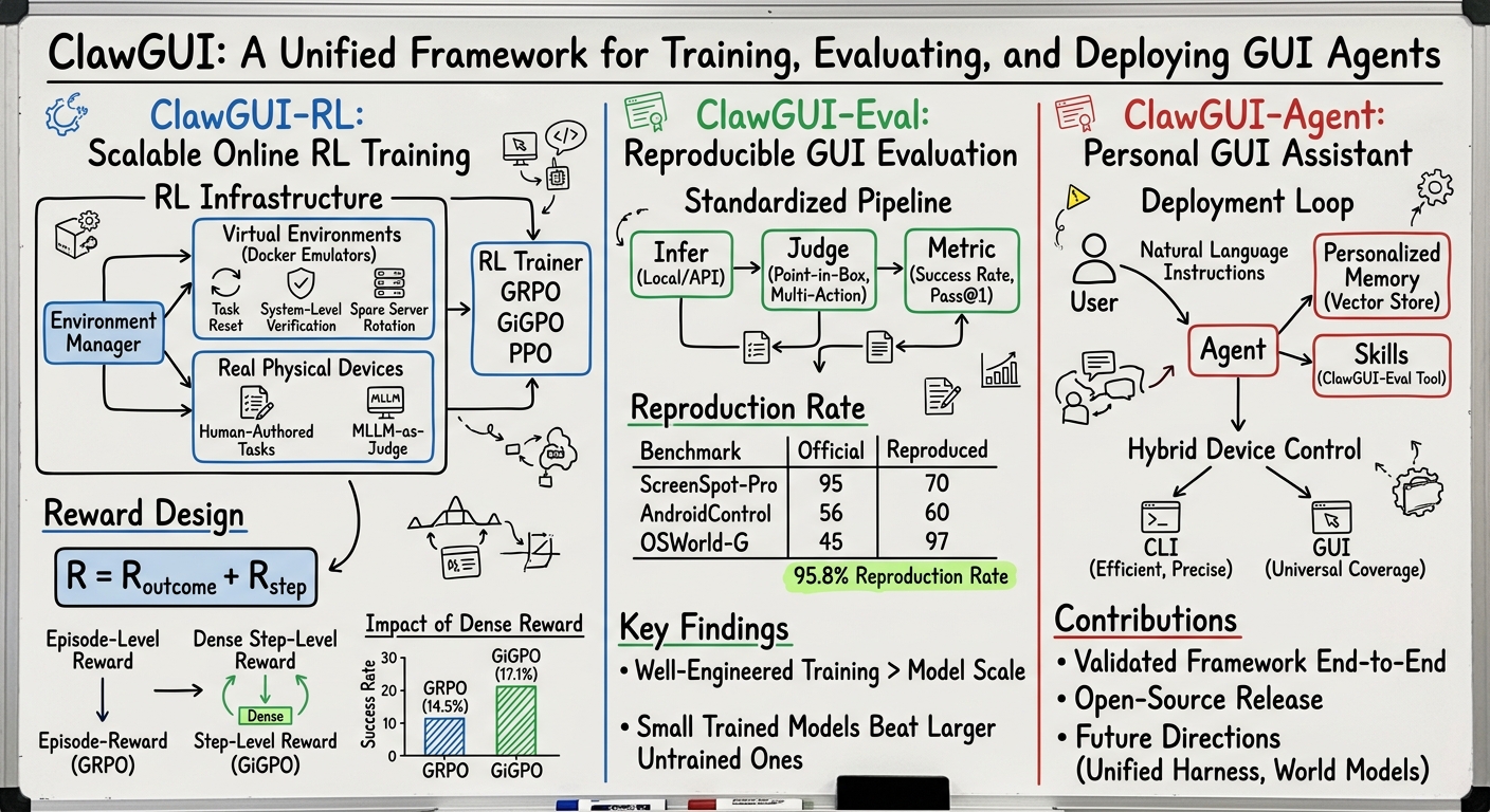 ClawGUI: A Unified Framework for Training, Evaluating, and Deploying GUI Agents - Summary