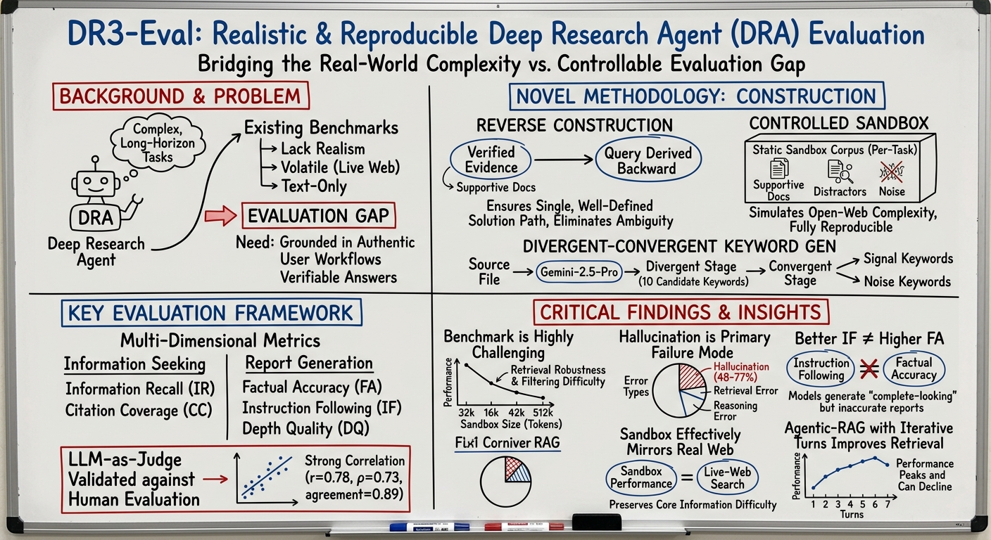 - Proposes DR³-Eval: A new benchmark designed for realistic, reproducible, and multimodal evaluation of Deep Research Agents (DRAs) focused on long-form, citation-grounded report generation. It addresses the tension between realism and reproducibility by using a static, per-task "sandbox corpus" that simulates the open web.