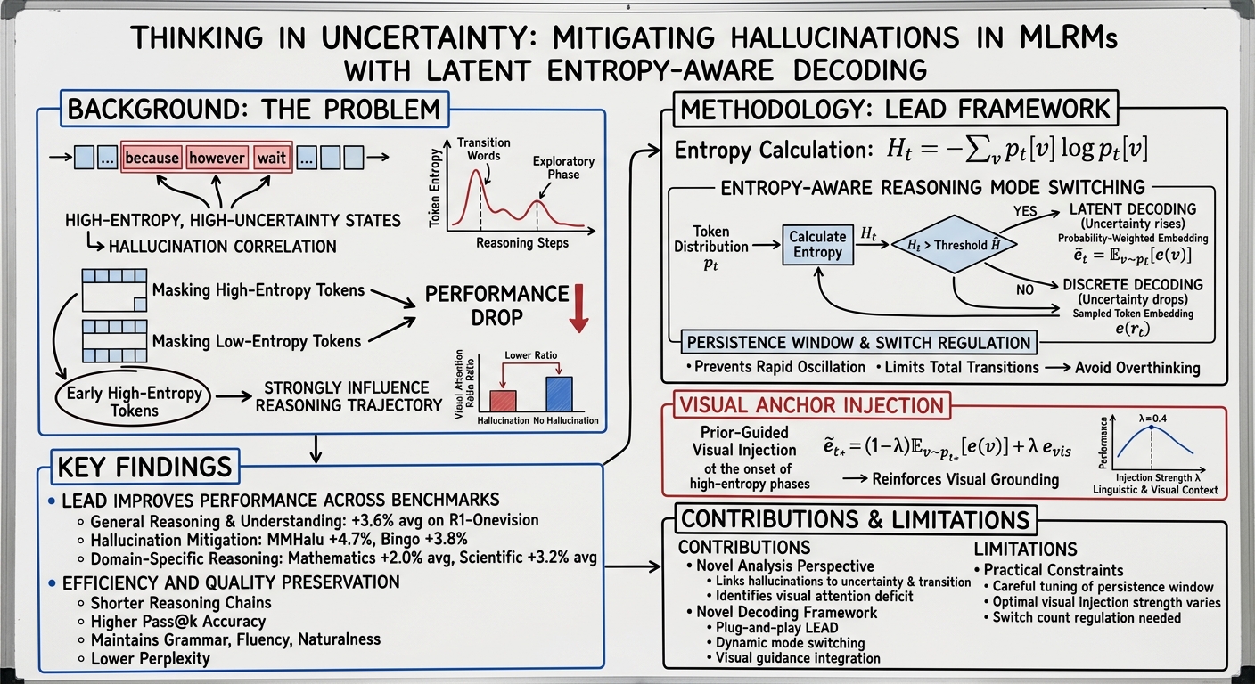 Motivated by these observations, the proposed Latent Entropy-Aware Decoding (LEAD) framework adaptively switches between discrete and latent semantic representations based on token-level entropy, while injecting visual guidance during high-uncertainty phases.