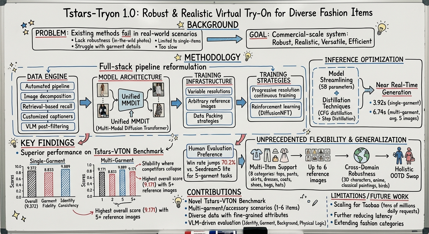 Existing methods exhibit a notable gap in meeting these demanding criteria. This work reformulates the full-stack pipeline—from data curation and model architecture to training strategies and inference optimization—to create Tstars-Tryon 1.0.