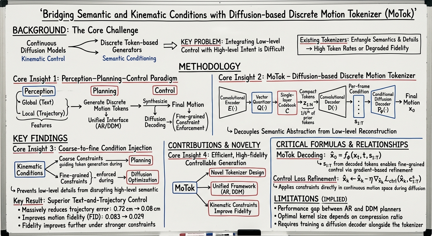 - Theoretical: Proposes a principled decomposition of motion generation into semantic planning and kinematic control, formalized by the Perception–Planning–Control paradigm. The diffusion-based tokenizer challenges the conventional VQ-VAE design by decoupling abstraction from reconstruction.