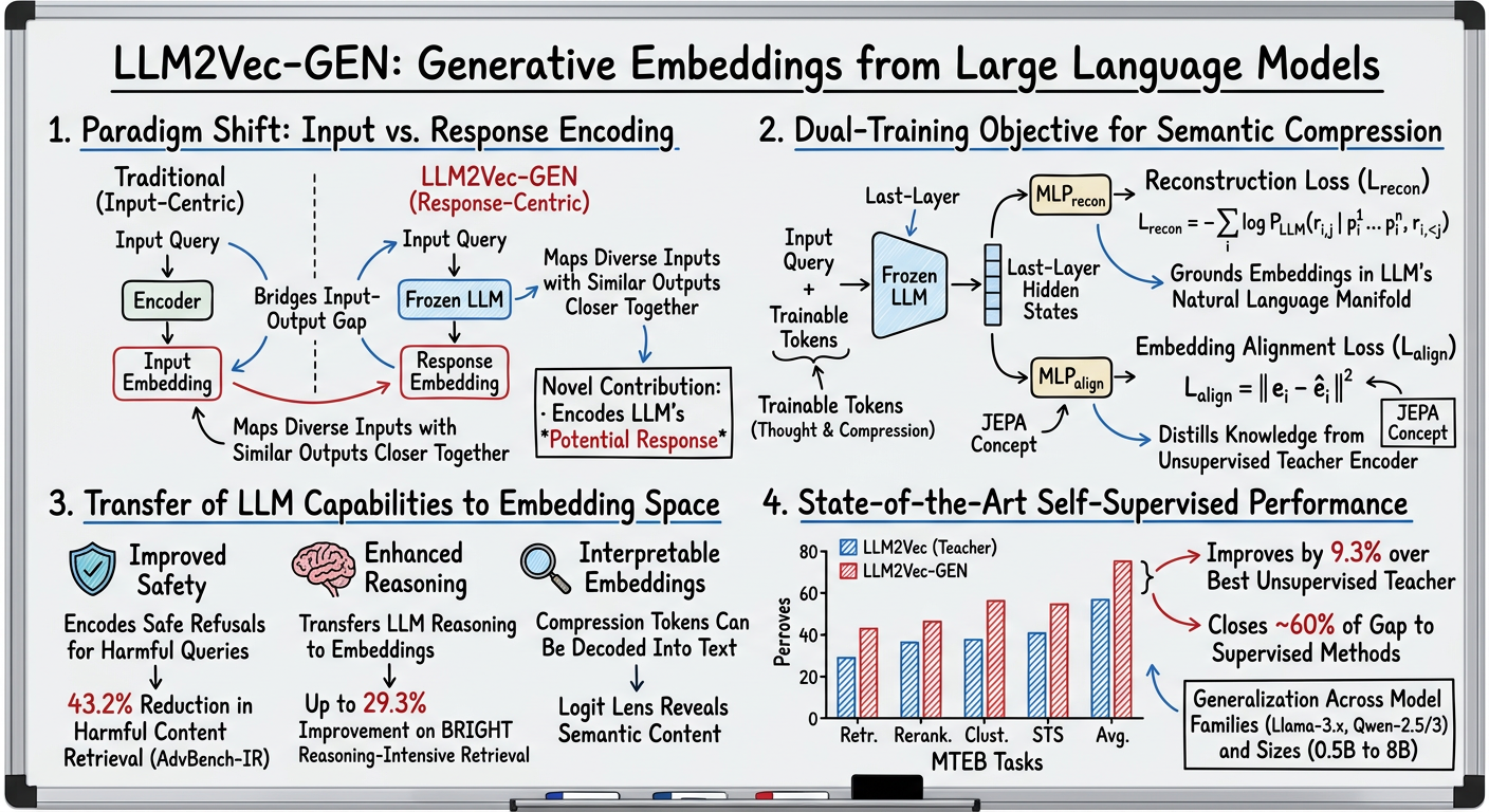 LLM2Vec-Gen introduces a novel self-supervised framework that redefines text embedding by learning to represent an LLM's potential response. By freezing the LLM and training only lightweight special tokens via a dual reconstruction and alignment objective, the method effectively bridges the input-output gap, achieves state-of-the-art self-supervised performance on MTEB, and successfully transfers safety and reasoning capabilities into the embedding space. The resulting embeddings are both high-performing and interpretable. This work positions generative embeddings as a powerful and efficient alternative for adapting large language models into high-quality text encoders, especially in data-scarce scenarios.