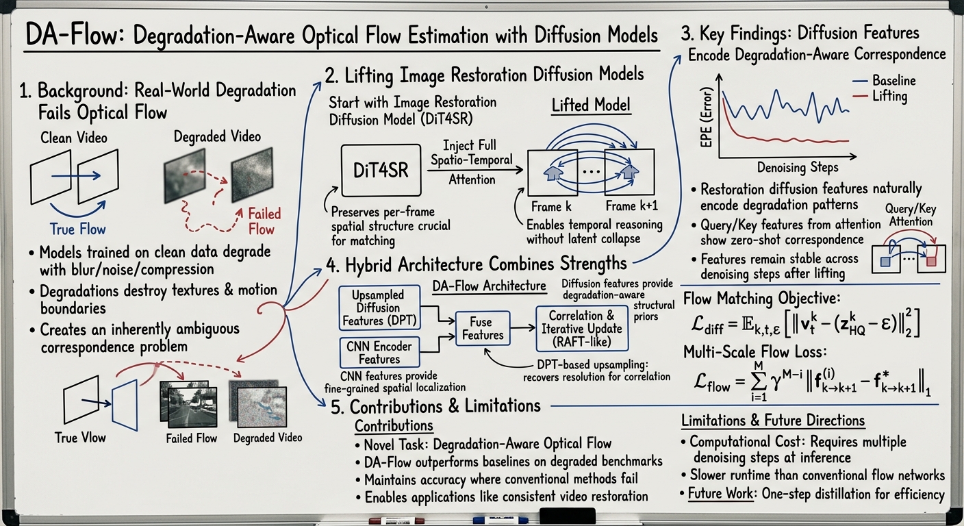 DA-Flow addresses the problem of estimating accurate optical flow from severely corrupted videos by introducing a degradation-aware approach. The core innovation is lifting a pretrained image restoration diffusion model with spatio-temporal attention to obtain features that are both corruption-aware and geometrically informative for correspondence. By fusing these features with a conventional CNN encoder within the RAFT framework, DA-Flow achieves state-of-the-art performance on degraded optical flow benchmarks. A key limitation is the inference cost due to multiple denoising steps; future work could explore one-step distillation to improve efficiency.