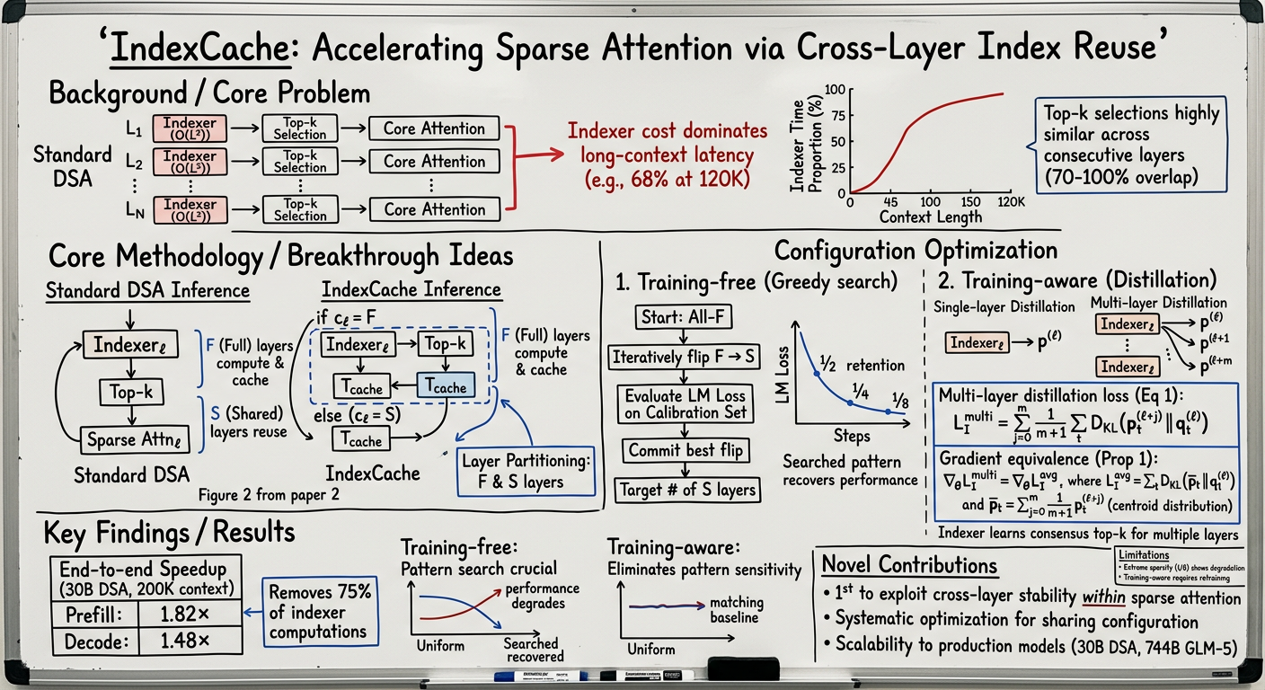 - Training-aware IndexCache: A multi-layer distillation loss trains each retained indexer against the averaged attention distributions of all layers it serves, enabling even simple uniform sharing patterns to match full-indexer accuracy.