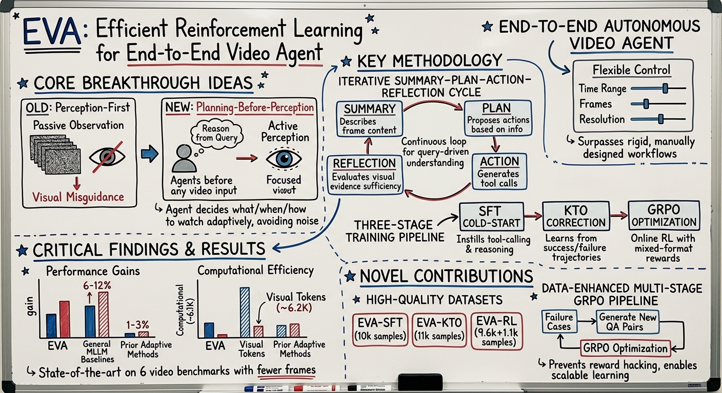 - Planning-Before-Perception Paradigm: Proposes EVA, a novel reinforcement learning framework where a Multimodal Large Language Model (MLLM) agent first reasons from a textual query to plan what, when, and how to watch a video, before any visual perception. This enables iterative summary–plan–action–reflection cycles for efficient, query-driven understanding.