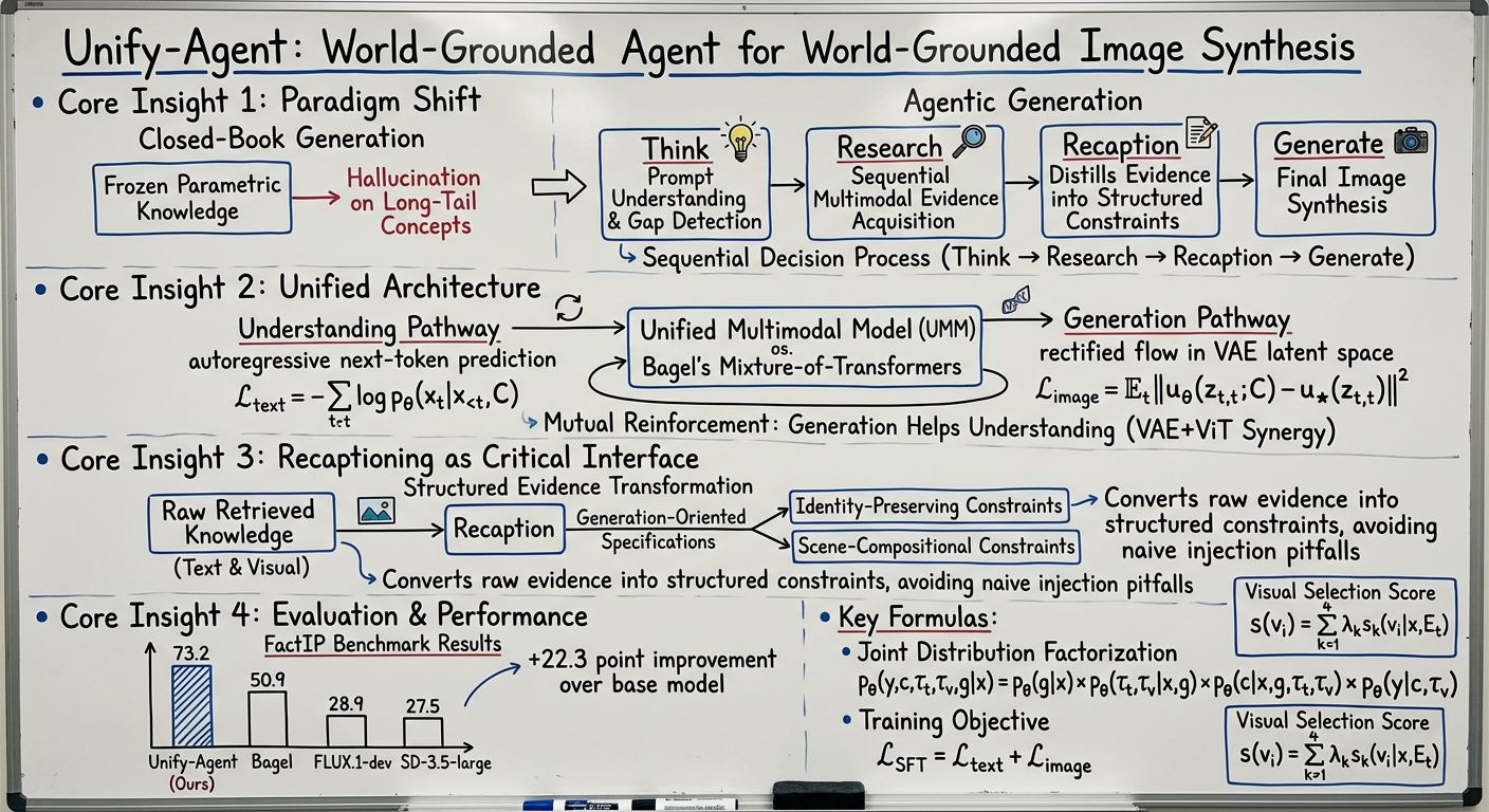 - Novel Agentic Paradigm: Unify-Agent reframes text-to-image (T2I) generation as an active, inference-time sequential decision process (Think, Research, Recaption, Generate) to address the limitation of relying solely on frozen parametric knowledge for generating long-tail and knowledge-intensive concepts.