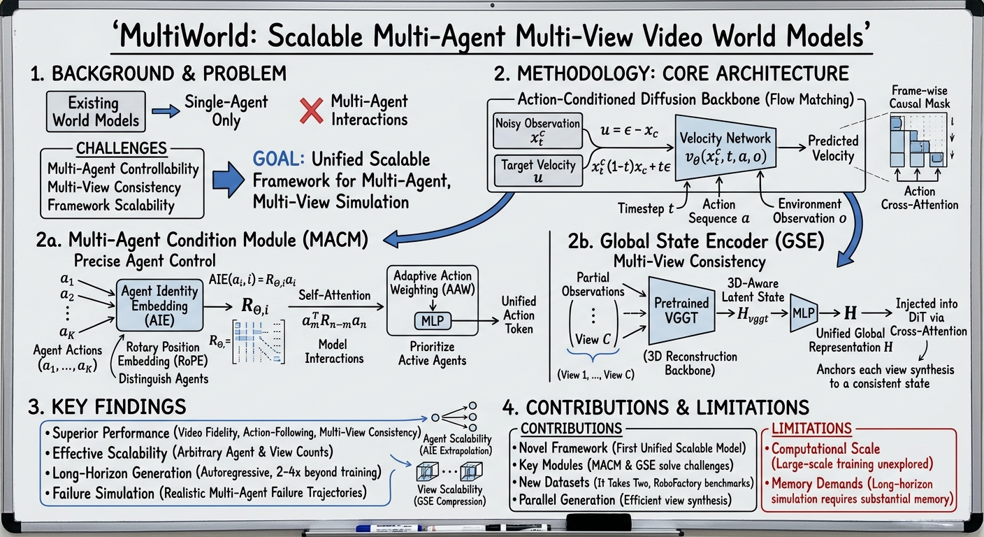 - Key Contribution: Introduces MultiWorld, a unified framework for scalable multi-agent, multi-view video world modeling that addresses three core challenges: multi-agent controllability, multi-view consistency, and framework scalability.