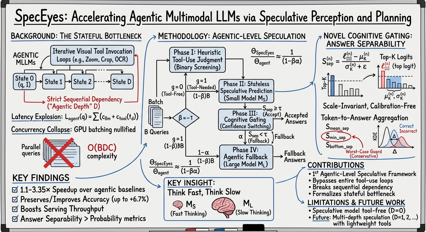 SpecEyes makes a conceptual leap by lifting speculation from the token level to the agentic level. The key observation is that many queries do not require deep tool-assisted reasoning. The framework proposes a heterogeneous "think fast, think slow" architecture: a small, non-agentic model ("fast thinking") speculatively answers queries, while the large agentic model ("slow thinking") is reserved only for queries that genuinely need multi-step tool interaction.