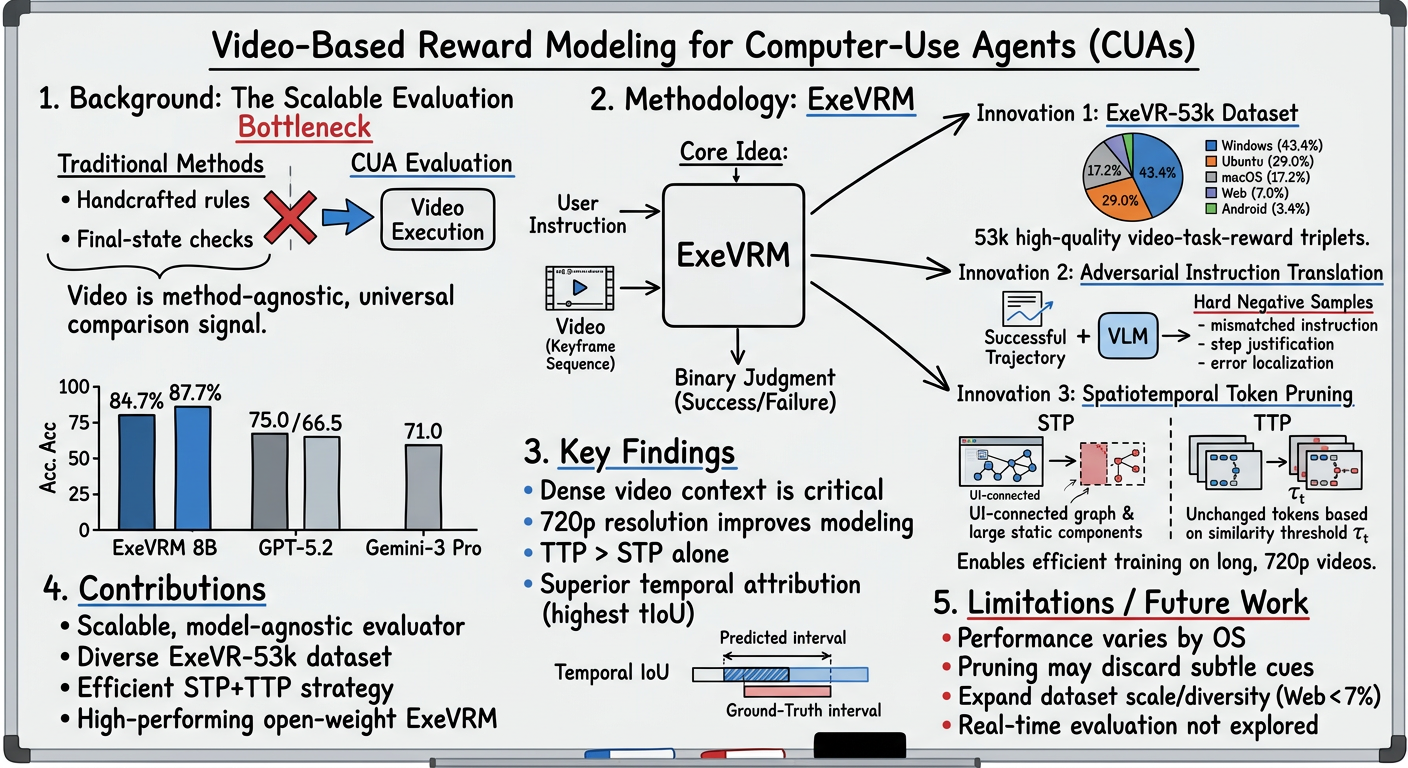 - Key Result: Fine-tunes an Execution Video Reward Model (ExeVRM) that achieves 84.7% accuracy and 87.7% recall on video-execution assessment, outperforming strong proprietary models like GPT-5.2 and Gemini-3 Pro across multiple platforms.