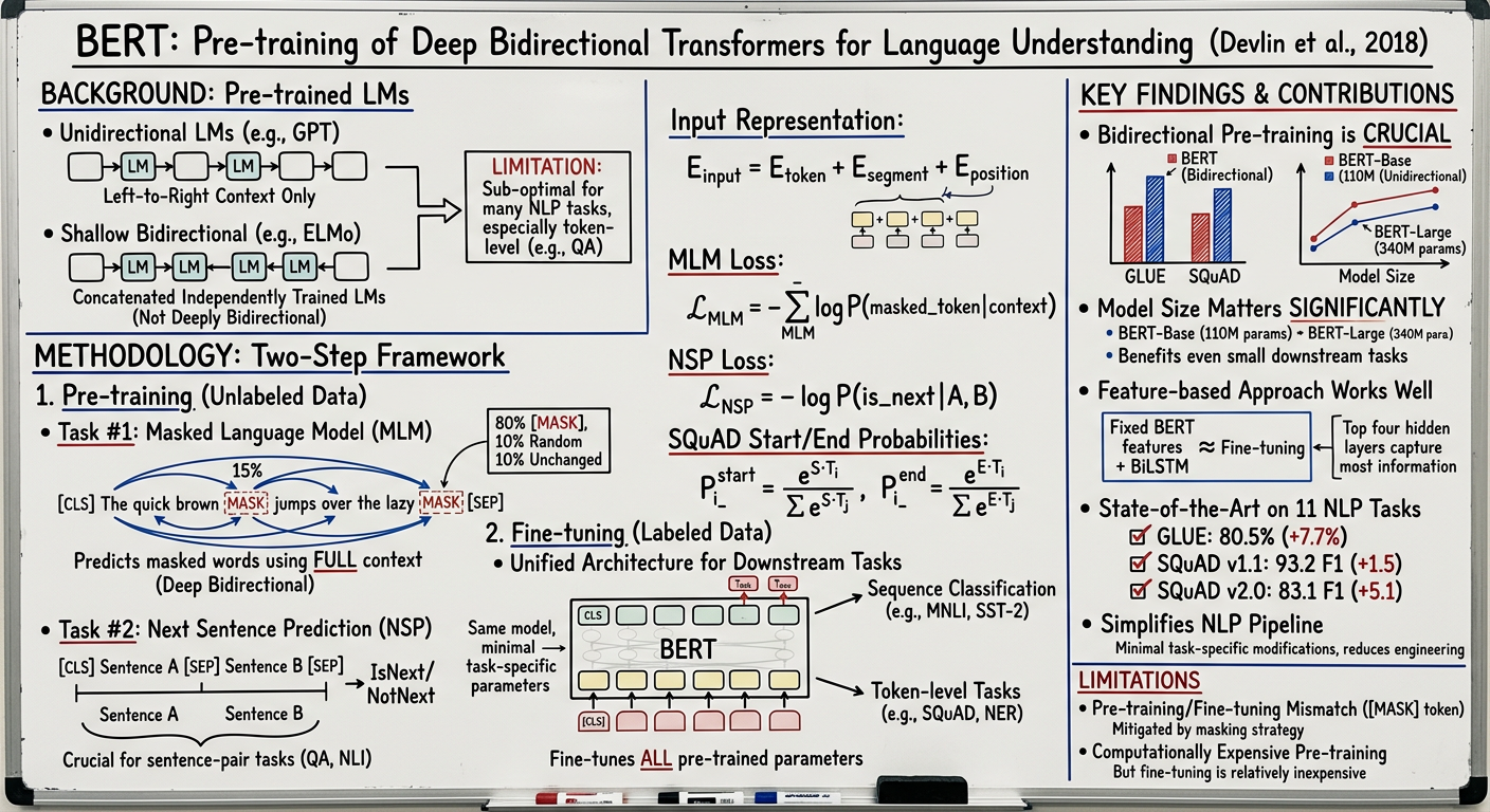 - Bidirectional Pre-training: Introduces BERT (Bidirectional Encoder Representations from Transformers), a model pre-trained using a novel "masked language model" (MLM) objective. Unlike previous models like OpenAI GPT, BERT is designed to pre-train deep bidirectional representations by conditioning on both left and right context in all layers.