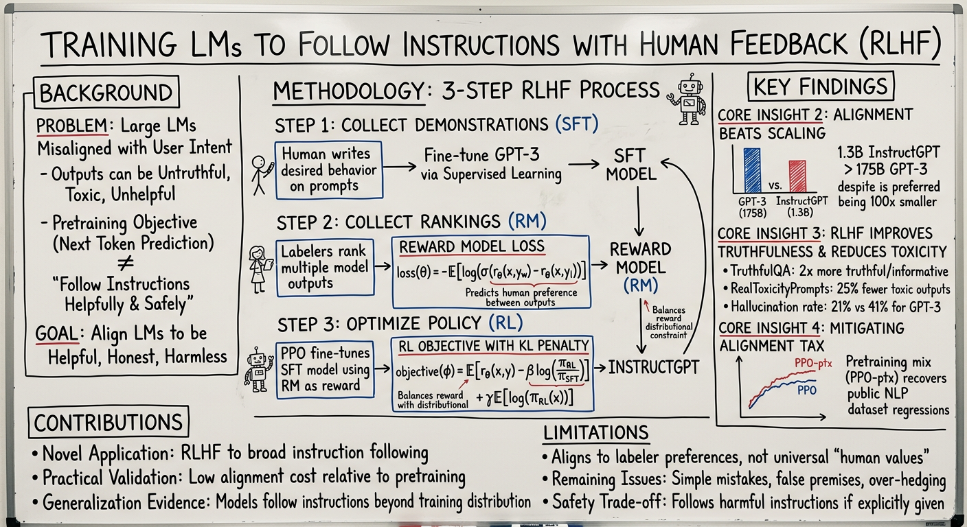 - Key Contribution: Introduces InstructGPT, a method for aligning large language models with human intent by fine-tuning GPT-3 using a three-step process of Supervised Fine-Tuning (SFT), Reward Modeling (RM), and Reinforcement Learning from Human Feedback (RLHF).