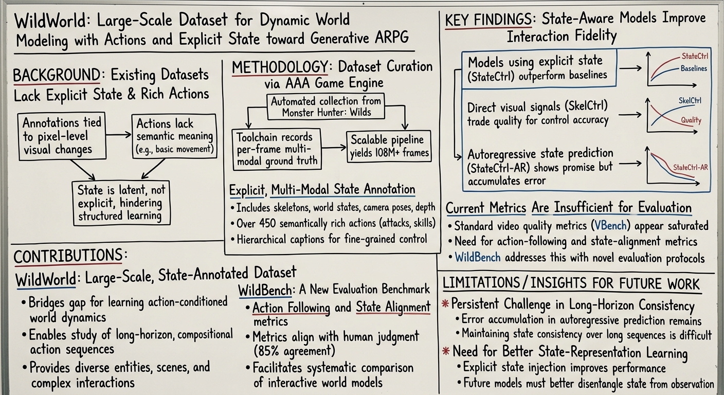 - Proposes WildWorld: A large-scale, action-conditioned video dataset for world modeling, automatically collected from the AAA game Monster Hunter: Wilds. It contains over 108 million frames with synchronized, per-frame ground-truth annotations including RGB, depth, camera pose, character skeletons, world states (e.g., health, location), and a rich action space of over 450 semantically meaningful actions.