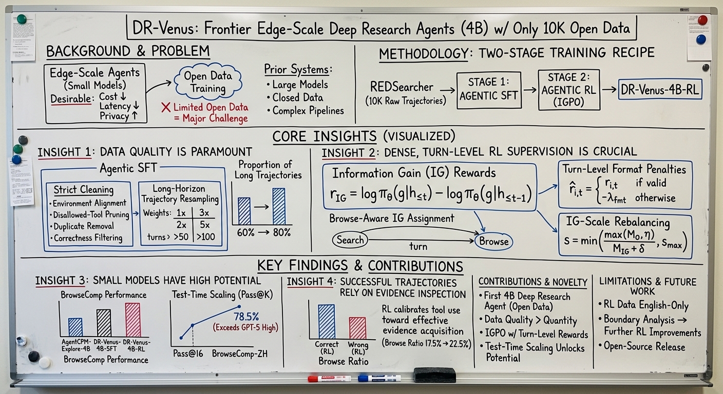 - Presents DR-Venus, a state-of-the-art 4-billion-parameter deep research agent built entirely on ~10K open-source data, designed for efficient edge-scale deployment.
