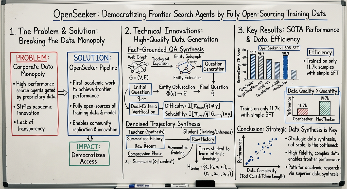 OpenSeeker represents a significant breakthrough in democratizing frontier search agent development. Through two innovative data synthesis methods, it produces high-fidelity training data that enables state-of-the-art performance with only 11.7k samples and simple SFT. The work: