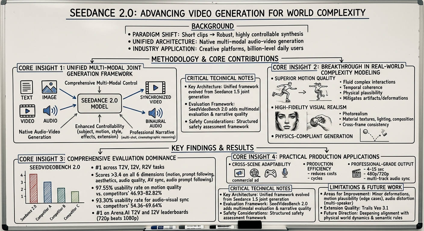 Seedance 2.0 represents a significant advancement in video generation technology, achieving state-of-the-art performance through a unified multi-modal audio-video joint generation framework. It delivers substantial improvements in modeling real-world complexity, motion stability, physical plausibility, audio fidelity, and multi-modal controllability.