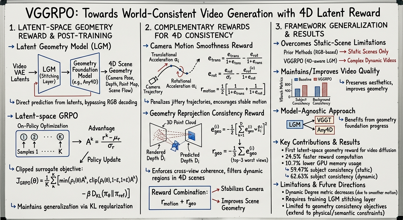 VGGRPO introduces a latent geometry-guided framework for world-consistent video generation. By constructing a Latent Geometry Model and performing latent-space GRPO with complementary camera motion and geometry reprojection rewards, it aligns pretrained video diffusion models toward 4D world consistency for both static and dynamic scenes.