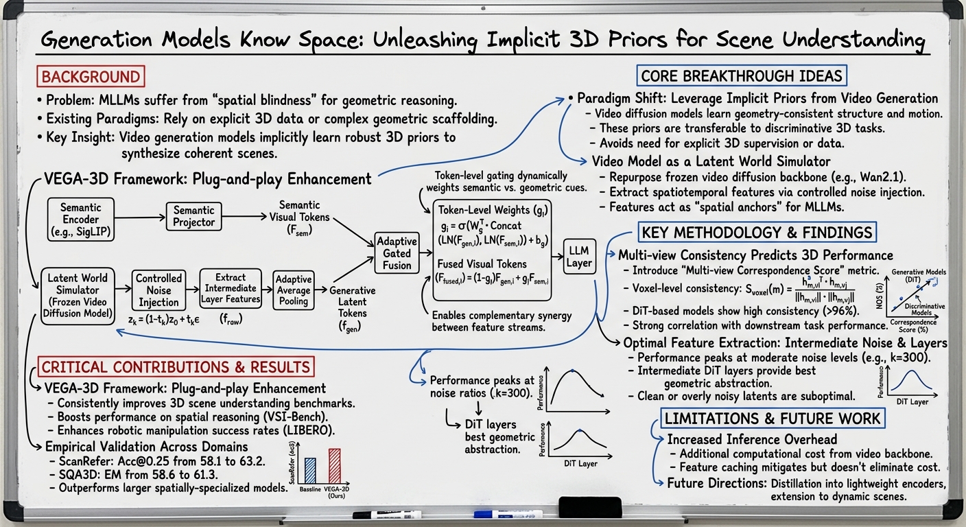 - VEGA-3D Framework: Introduces VEGA-3D (Video Extracted Generative Awareness), a plug-and-play framework that repurposes a frozen video diffusion model (e.g., Wan2.1) as a Latent World Simulator to extract spatiotemporal geometric features, which are fused with semantic features via an Adaptive Gated Fusion module.