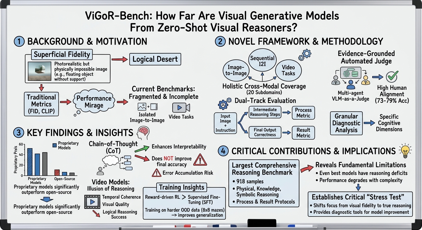 - Introduces ViGoR-Bench, a comprehensive benchmark designed to evaluate the reasoning capabilities of visual generative models (Image-to-Image and Video tasks), moving beyond traditional metrics that focus solely on visual fidelity.
