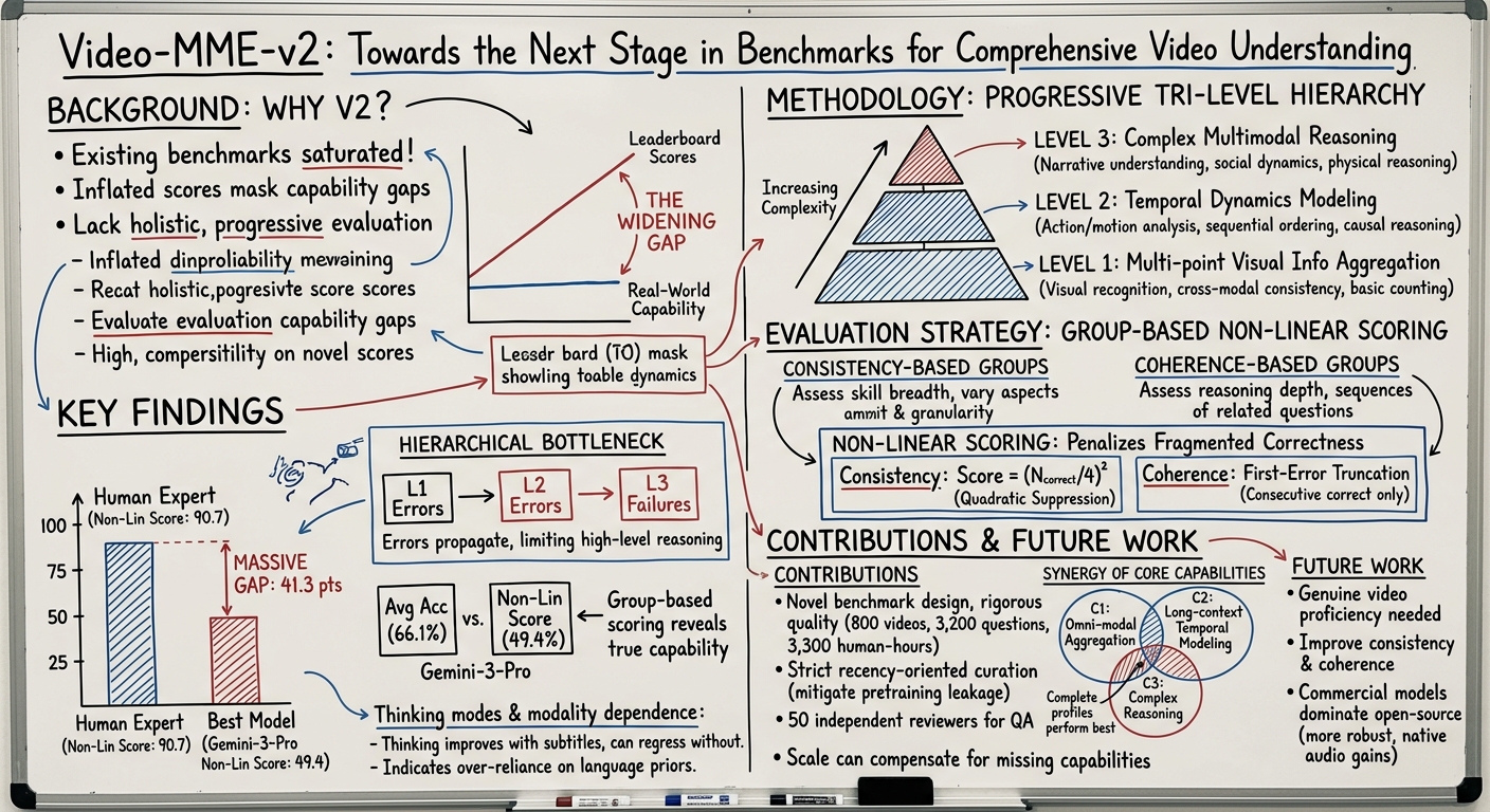 Video-MME-v2: Towards the Next Stage in Benchmarks for Comprehensive Video Understanding - Summary