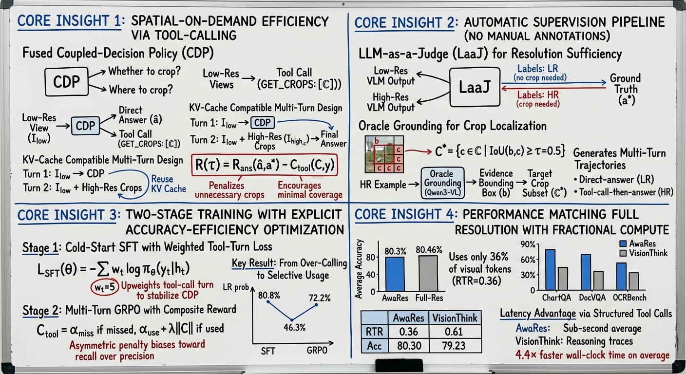 - Spatial-on-Demand Efficiency: Introduces AwaRes, a framework that processes a low-resolution global image view by default and uses tool-calling to request only the specific high-resolution image crops needed to answer a query, dramatically reducing computational costs.
