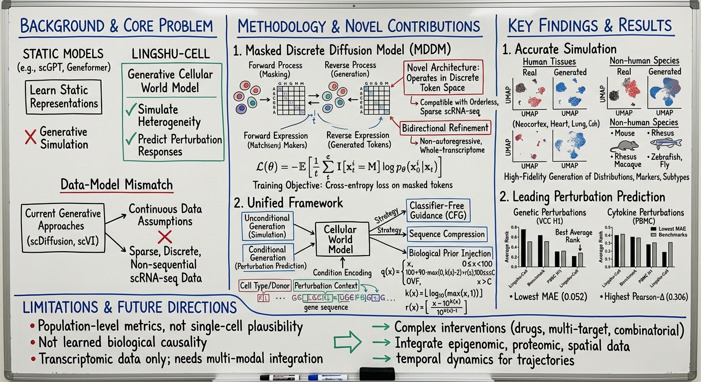 - Core Innovation: Lingshu-Cell is a Masked Discrete Diffusion Model (MDDM) designed as a generative "cellular world model" that learns the distribution of single-cell transcriptomic states and supports conditional simulation under perturbation.