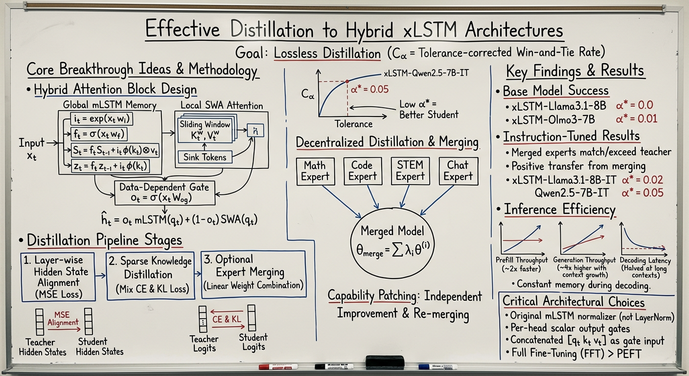 - Key Method: Introduces a distillation pipeline featuring a hybrid mLSTM-SWA architecture and an optional expert merging stage. The hybrid combines a global mLSTM (for long-range dependencies) with local Sliding Window Attention (SWA) and sink tokens, gated dynamically.