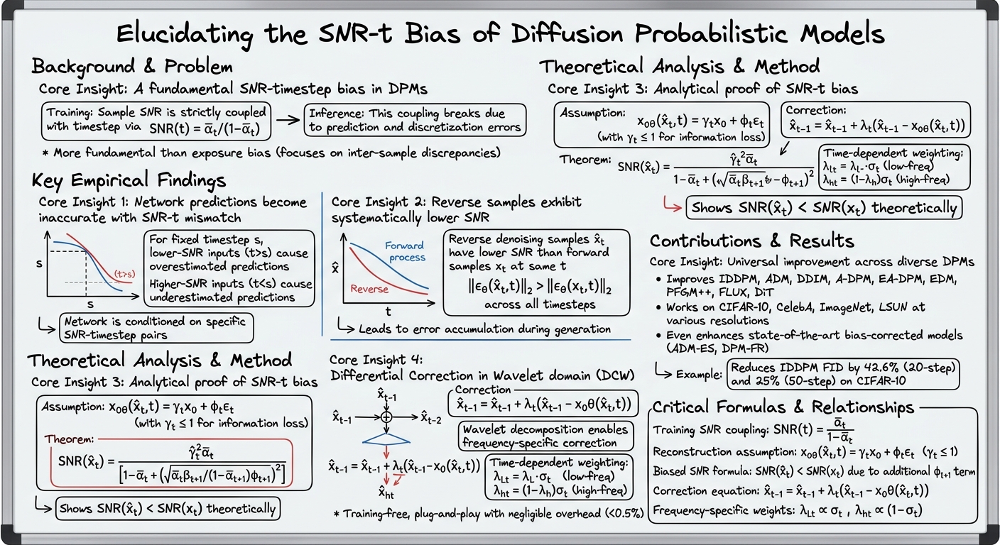 - Identifies a novel SNR-t Bias: Diffusion Probabilistic Models (DPMs) suffer from a Signal-to-Noise Ratio-timestep (SNR-t) bias, where the SNR of the predicted sample during inference does not match its assigned timestep, unlike the strict coupling during training.