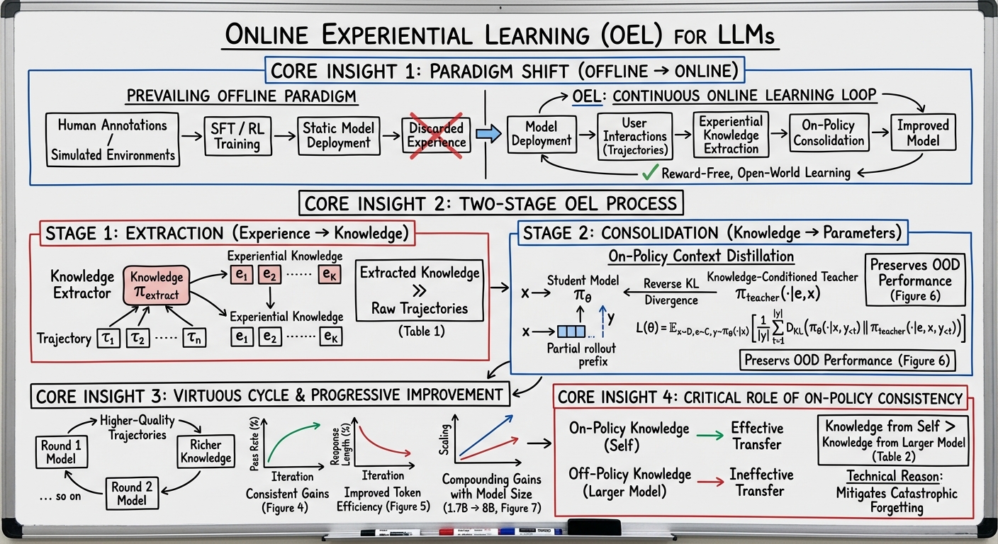 - Key Contribution: Introduces Online Experiential Learning (OEL), a reward-free framework that enables Large Language Models (LLMs) to continuously improve from their own deployment experience, forming an online learning loop.