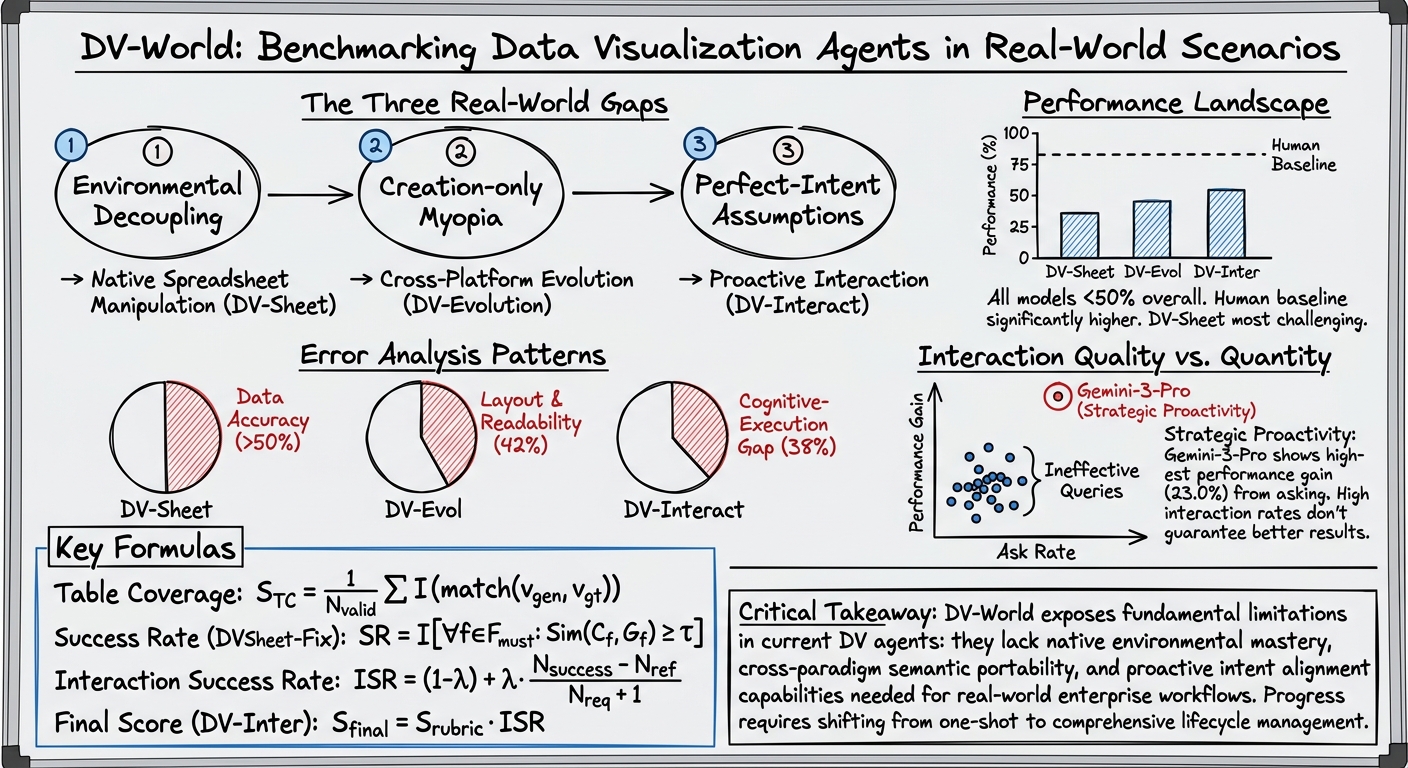 - Theoretical: DV-World establishes a new paradigm for evaluating DV agents, shifting focus from isolated code generation to integrated lifecycle management encompassing environmental mastery, semantic portability, and proactive alignment. It provides a structured taxonomy of real-world challenges (e.g., fix types, ambiguity points).