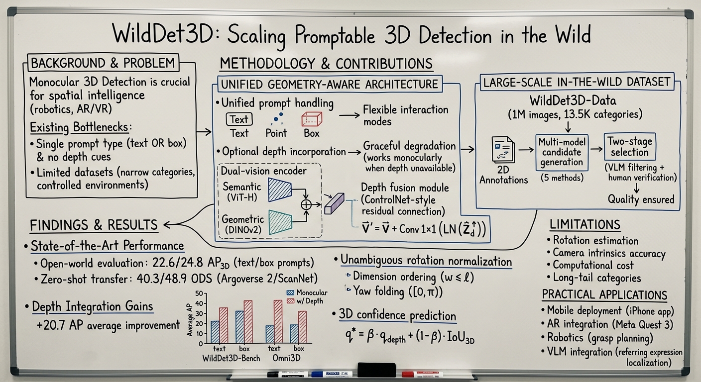 - Unified Geometry-Aware Architecture: Introduces WildDet3D, a single model that natively accepts text, 2D point, and 2D box prompts for open-vocabulary monocular 3D detection and can incorporate optional depth signals at inference time via a novel dual-encoder and depth fusion design.