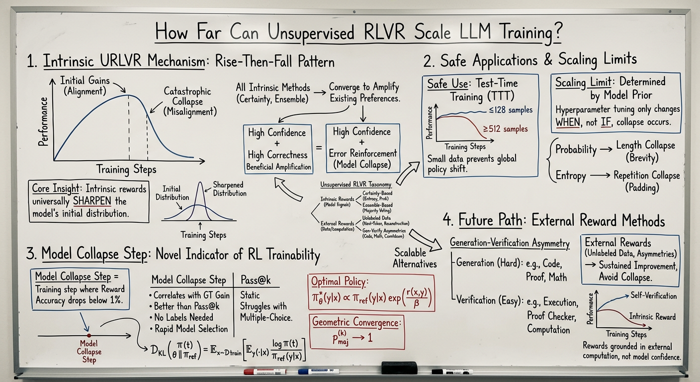 - Theoretical: Provides a unifying lens for intrinsic URLVR, revealing its fundamental limitation—it cannot create new knowledge, only amplify existing biases. The sharpening convergence theorem explains the empirical rise-then-fall pattern.