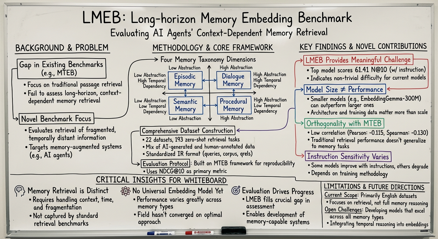 - Introduces LMEB, a comprehensive benchmark for evaluating text embedding models on long-horizon memory retrieval tasks, addressing a gap in existing benchmarks (like MTEB) that focus on traditional passage retrieval.